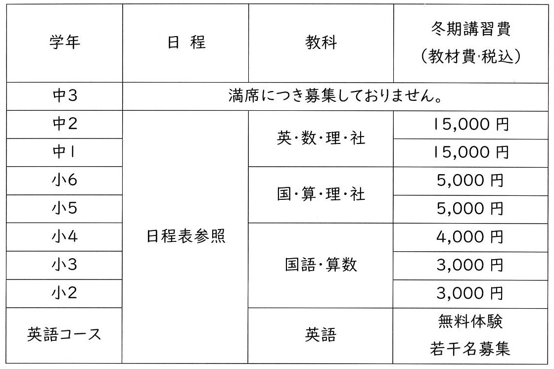 (英語コースについては、冬期期間の授業を無料体験としてご利用いただけます。)
